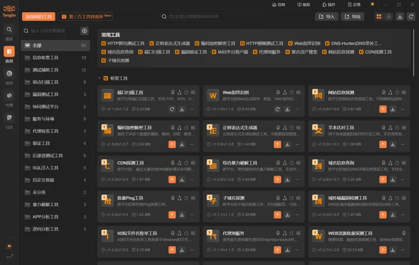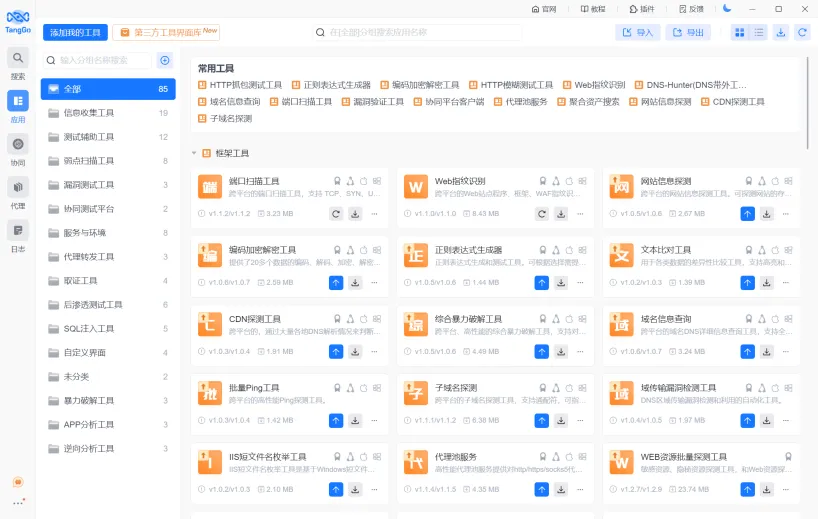 TangGo提供了信息收集、弱点扫描、漏洞测试、测试辅助等测试过程所需的40多款常用工具,并且在持续扩充。