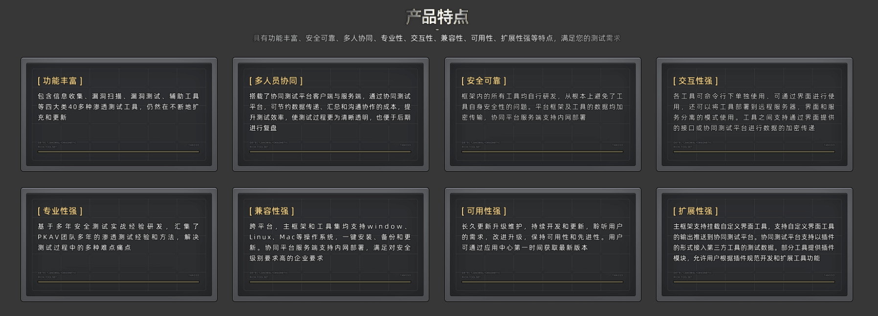 - 安全可靠:框架内的所有工具均自行研发,从根本上避免了工具自身安全性的问题。平台框架及工具的数据均加密传输,协同平台服务端支持内网部署。